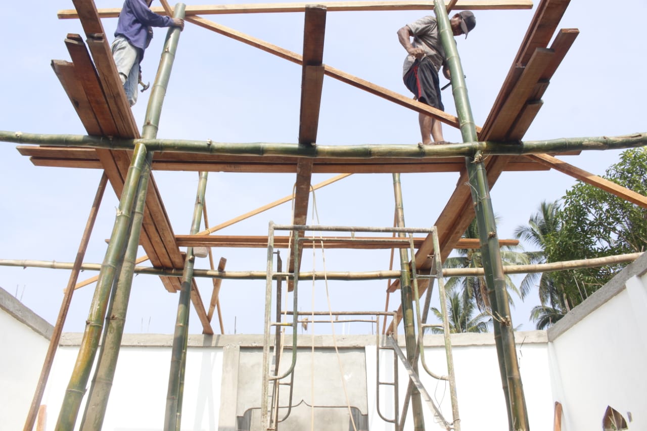 Pemasangan kuda-kuda yang berada di bagian paling atas bangunan tersebut dilakukan setelah pondasi dan bangunan dan dinding telah berdiri kokoh, Minggu (01/10/2023).