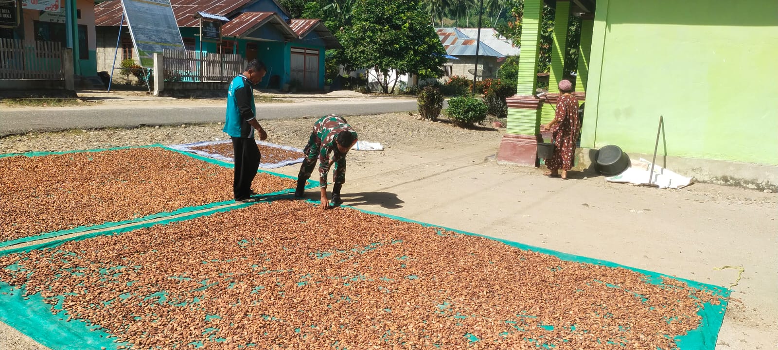 Dalam pelaksanaannya, Babinsa Pratu Puguh turut berperan aktif di lapangan dengan memastikan proses penjemuran berlangsung secara maksimal, mulai dari pengaturan posisi biji kakao hingga pemantauan kondisi cuaca yang sangat berpengaruh terhadap hasil akhir.