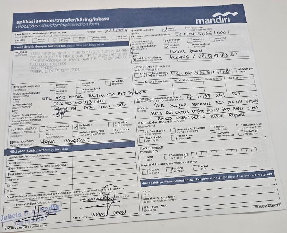“Pembayaran ini tercatat dalam Surat Tanda Terima Pembayaran yang dikeluarkan oleh Jaksa Eksekutor pada Kejaksaan Negeri Tolitoli. Selanjutnya, uang pengganti dan denda yang totalnya mencapai Rp1.337.241.567 telah diserahkan kepada bendahara penerima Kejaksaan Negeri Tolitoli untuk dipindahbukukan ke rekening kas negara dalam waktu 1×24 jam,” ujar Albertinus.