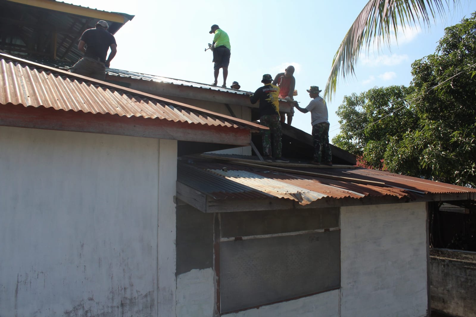Anggota Satgas TMMD 118 bersama warga bergotong royong merehab atap Mesjid Nurul Iman yang cukup memicu adrenalin, Rabu (11/10/2023).