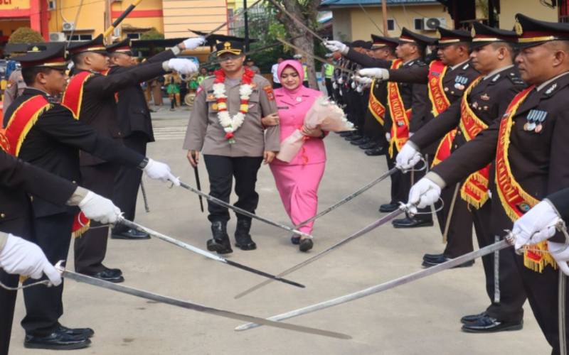 Dari lokasi, penyambutan dengan Pedang Pora sebagai bentuk penghormatan kepada Kapolres yang baru serta acara pelepasan untuk Kapolres yang lama.