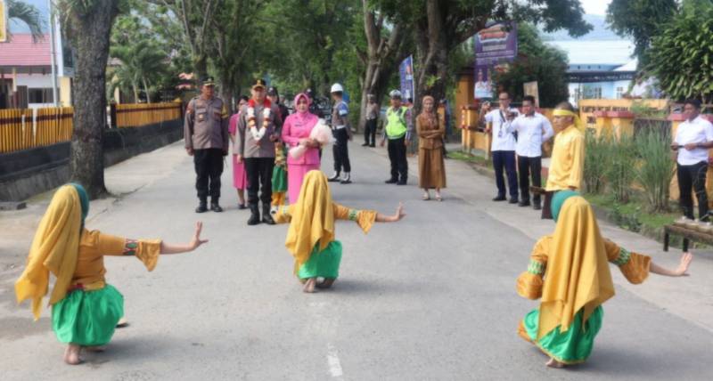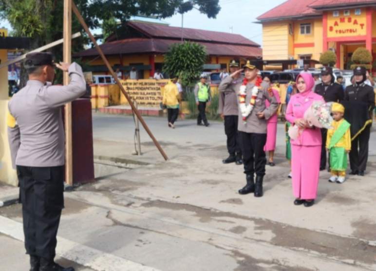 Sebelum memasuki gerbang Mapolres Tolitoli, AKBP Bambang Herkamto, SH beserta istri Ny. Dian Herkamto disambut dengan pengalungan bunga, Tarian Maragai dan Tarian Moduain tabur beras sebagai ucapan pendatang selalu diberkahi dan diberikan keselamatan.
